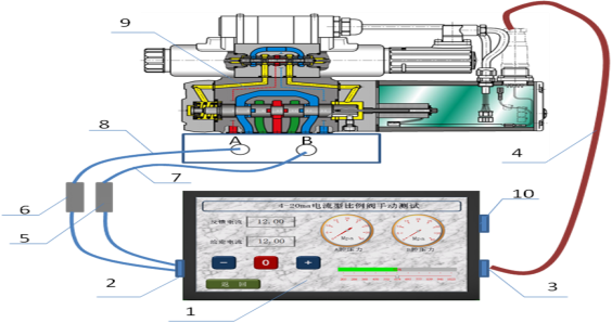 1、在線判斷液壓控制閥設備故障;在現代化的生產線包含有液壓控制閥的設備一旦出現故障,普通員工很難判斷是機械故障、液壓故障還是電氣控制故障;該儀器可解決上述問題,一步,斷開與液壓控制閥相連的電氣插頭,把本儀器配套的插頭插上,二步,將壓力傳感器的兩根測壓線連接到液壓控制閥的A、B口測壓點上,三步,打開本儀器電源,選擇與液壓控制閥相對應的信號,手動測試即可判斷是機械故障、液壓故障還是電氣控制故障;如下圖: