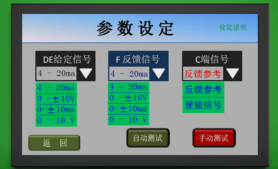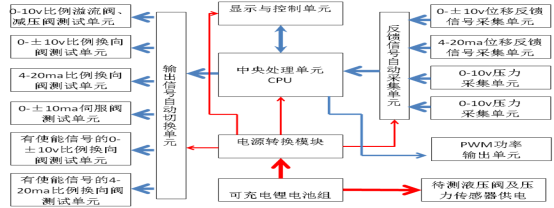 this new designed intelligent fault diagnosis tester can not only output 0-2A PWM current of the external special amplify board, but also output the 4-20ma、0-±10v、0-±10ma and 0-10v signal, and at same time collect the hydraulic proportion, displacement signal of servo valve core and oil pressure of hydraulic control valve output port synchronously. 7” touch screen is adopted to enable the user operates the testing procedure of hydraulic control valve according to the built-in instruction manual intuitively.