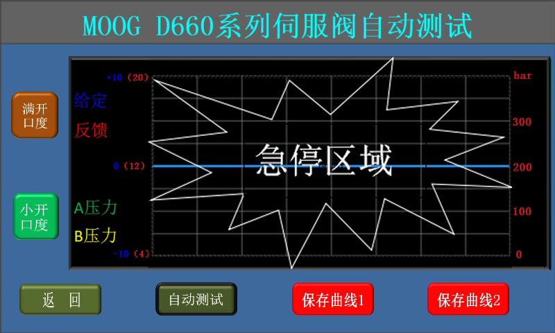 自動測試過程中出現緊急情況,可點擊屏幕中間黑色的曲線部分,儀器將給伺服閥斷電,重新選擇開口度后儀器會再次給伺服閥上電;