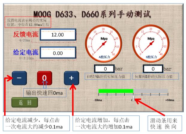 6、伺服閥正常時的表現為:a、給定電流0ma時,反饋電流在12.00ma,伺服閥輸出的A、B腔壓力相同;b、用滑動條可迅速換向,反饋電流改變且A、B腔壓力差較大;c、點擊增加按鈕,反饋電流逐漸增加且A、B腔壓力差逐漸增大;d、點擊減少按鈕,反饋電流逐漸減少且A、B腔壓力差逐漸減少,過0ma后伺服閥會換向;